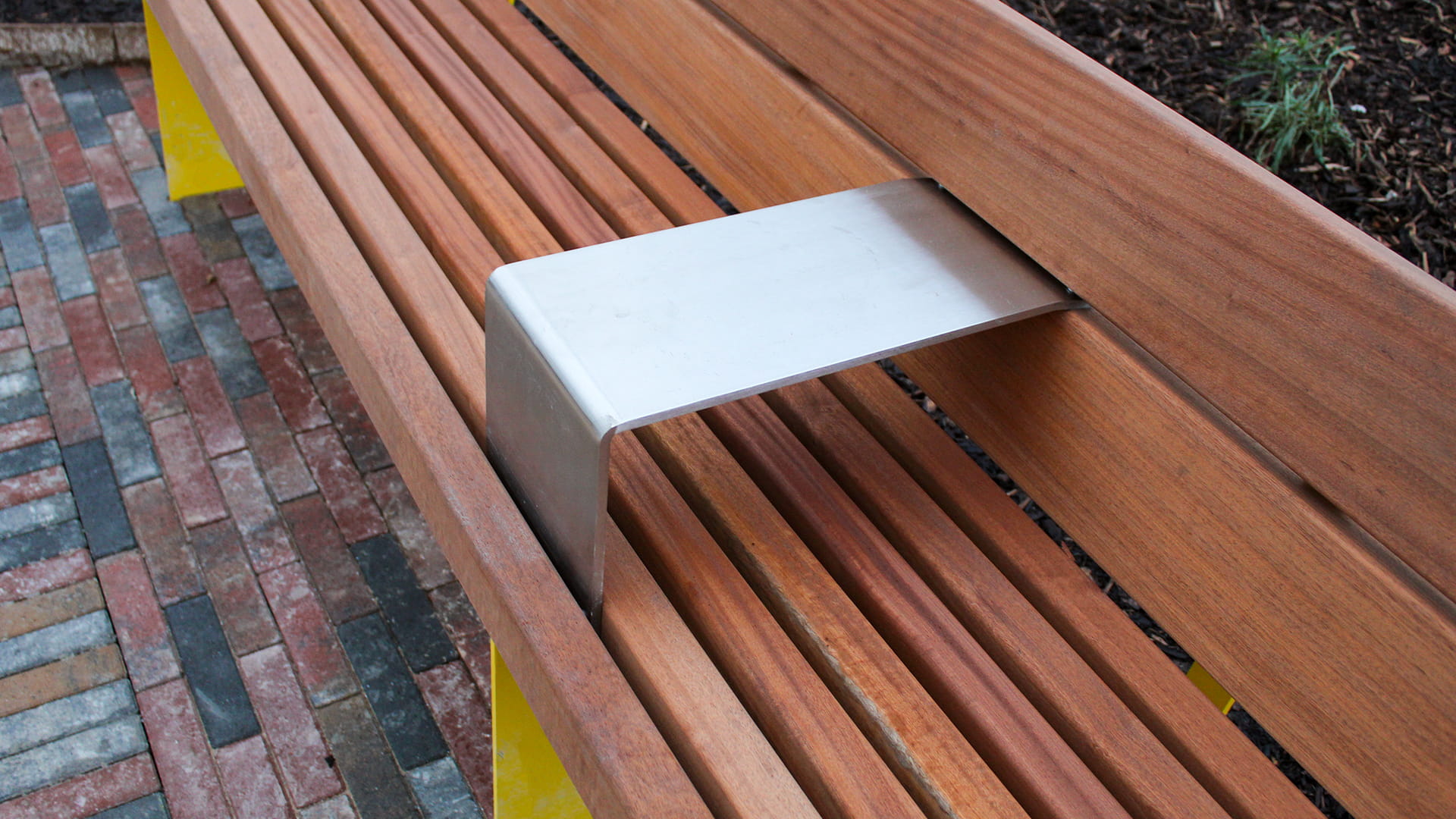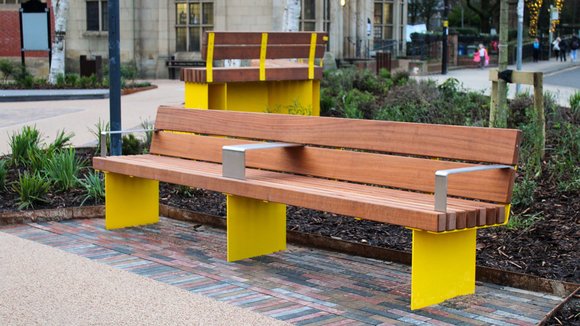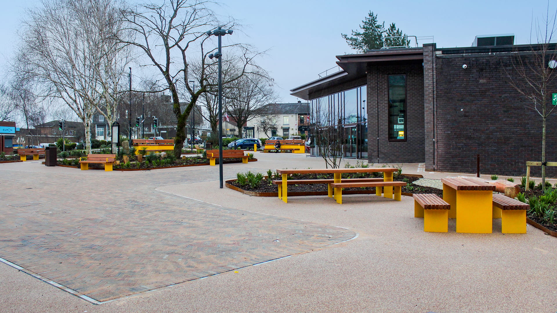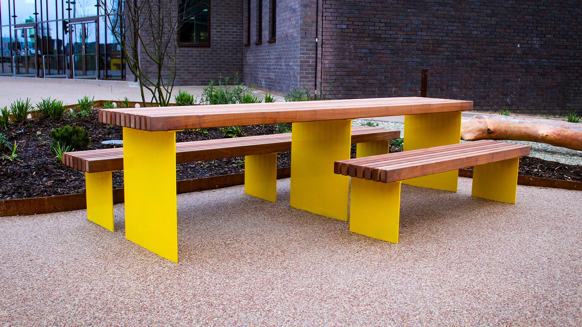 To encourage everyday use of the square, BSFG supplied Greengate seating and picnic sets, finished in a vibrant yellow powder coating to bring energy and warmth into the space. Wheelchair-accessible picnic tables were also included, ensuring the square is welcoming and usable for everyone.