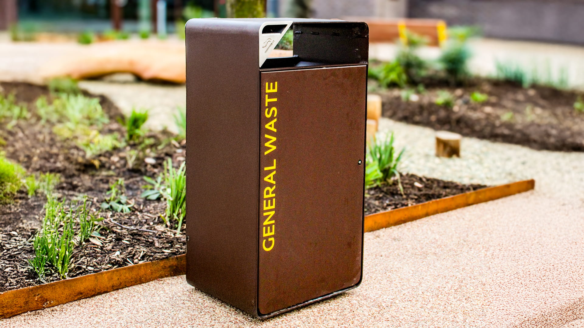 Waste and recycling provision was delivered using our Box Solid litter bins in a corten-style powder-coated finish, complete with yellow vinyl signage and discreet corner ashtrays to keep the space clean and well-maintained.
