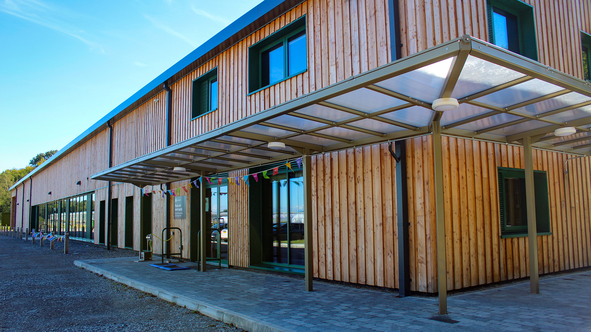 The result is a robust yet elegant canopy that complements the timber-framed, net-zero building while providing a durable, low-maintenance shelter tailored to the centre’s operational needs.