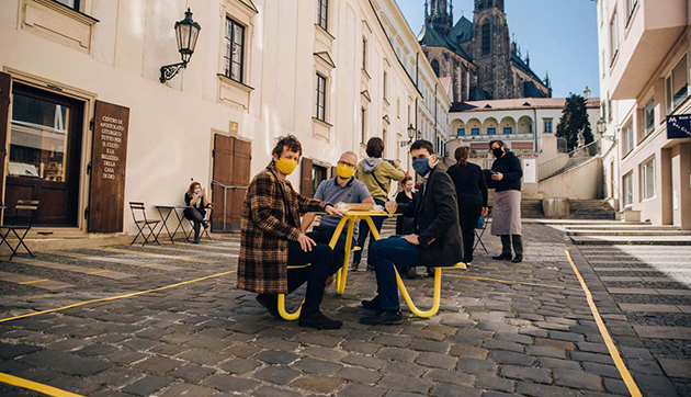 Every zone is surrounded by a circle of tape, with a non-movable, one-piece dining set in the middle, akin to a metal picnic table. The first prototype has already been installed in the streets of Brno, where a confirmed pilot program will soon convert the city’s public squares into "gastro safe zones". The architects have also launched a furniture brand named Stoolky, which offers dining sets in different colours and a varying number of seats. After Covid-19, the furniture can be reused in parks, playgrounds or as street furniture.