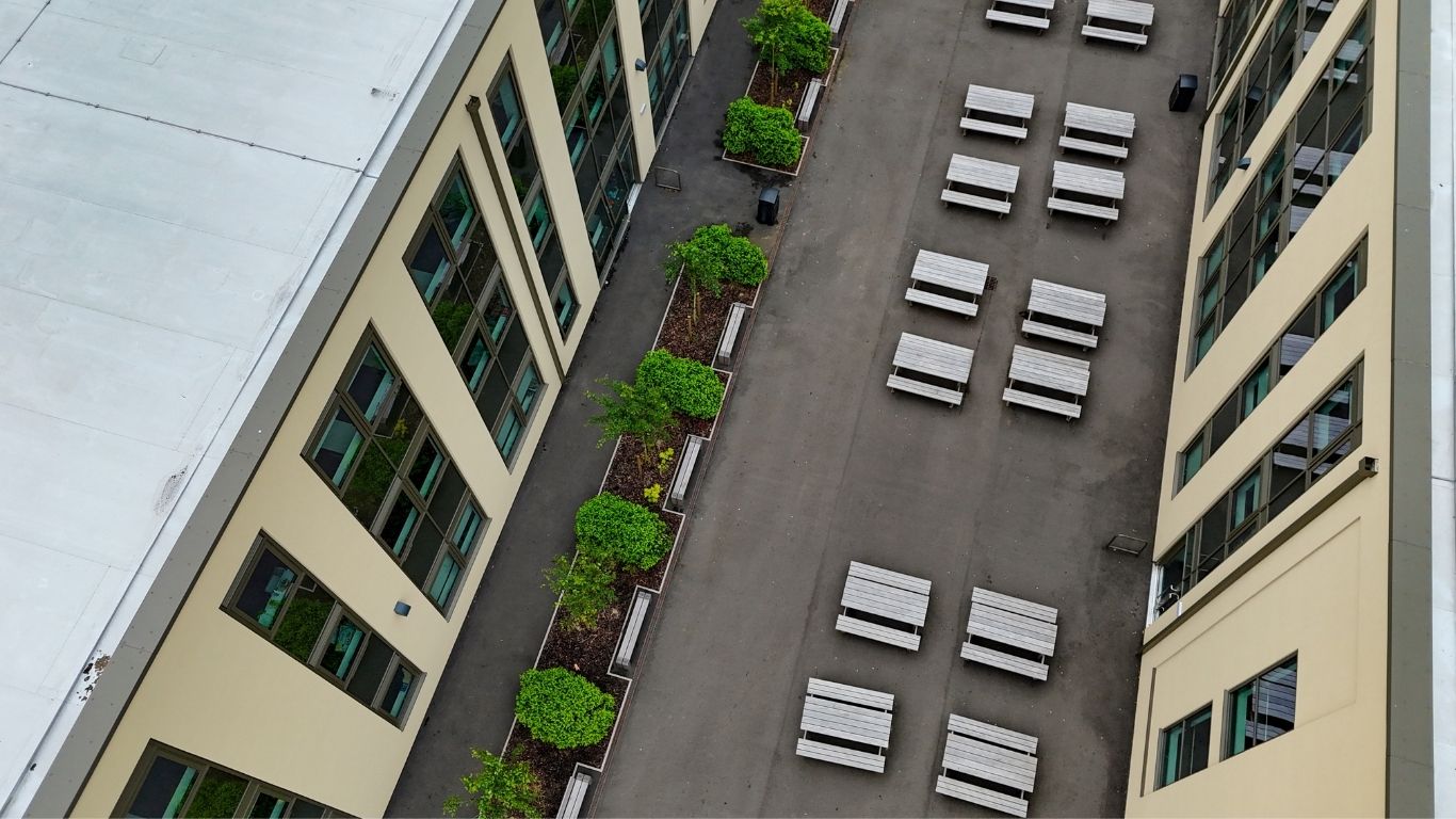 The landscape design by Arup plays a critical role in enhancing both student and teacher experiences. Between each wing, mini plant gardens have been established, promoting creativity and providing a refreshing change of environment. These gardens are self-sustaining, with rainwater collected from the roof irrigating the plants, thereby supporting mental health and environmental sustainability.