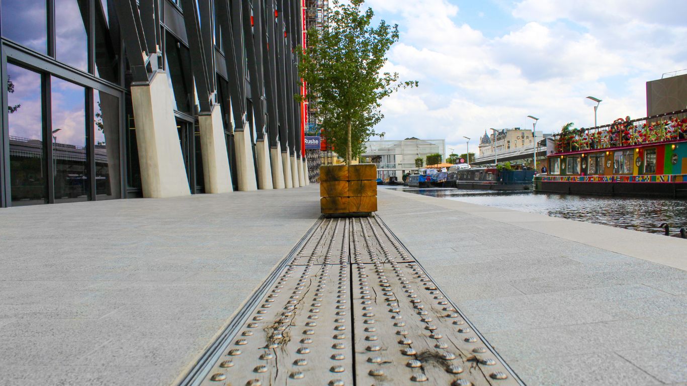 The walkway features over 6,200 non-slip tactile studs set-in and meticulously aligned by hand to maintain a high-level finish throughout, and which provide an important safety function in demarcating the building frontage from the Paddington Branch canal.