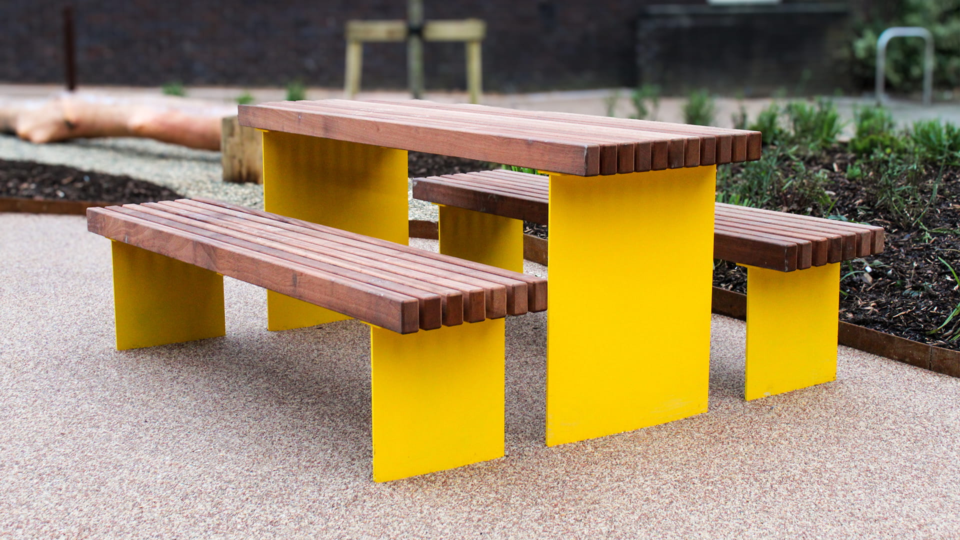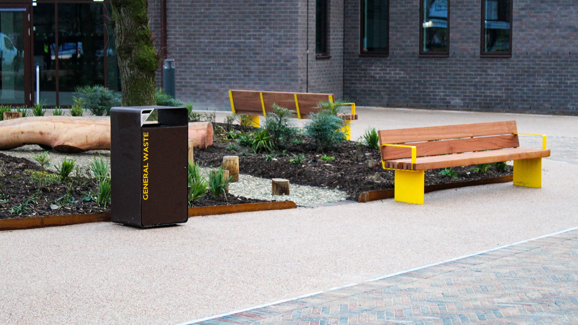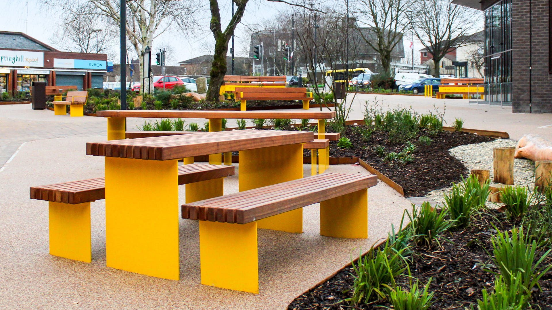 To encourage everyday use of the square, BSFG supplied Greengate seating and picnic sets, finished in a vibrant yellow powder coating to bring energy and warmth into the space. Wheelchair-accessible picnic tables were also included, ensuring the square is welcoming and usable for everyone.