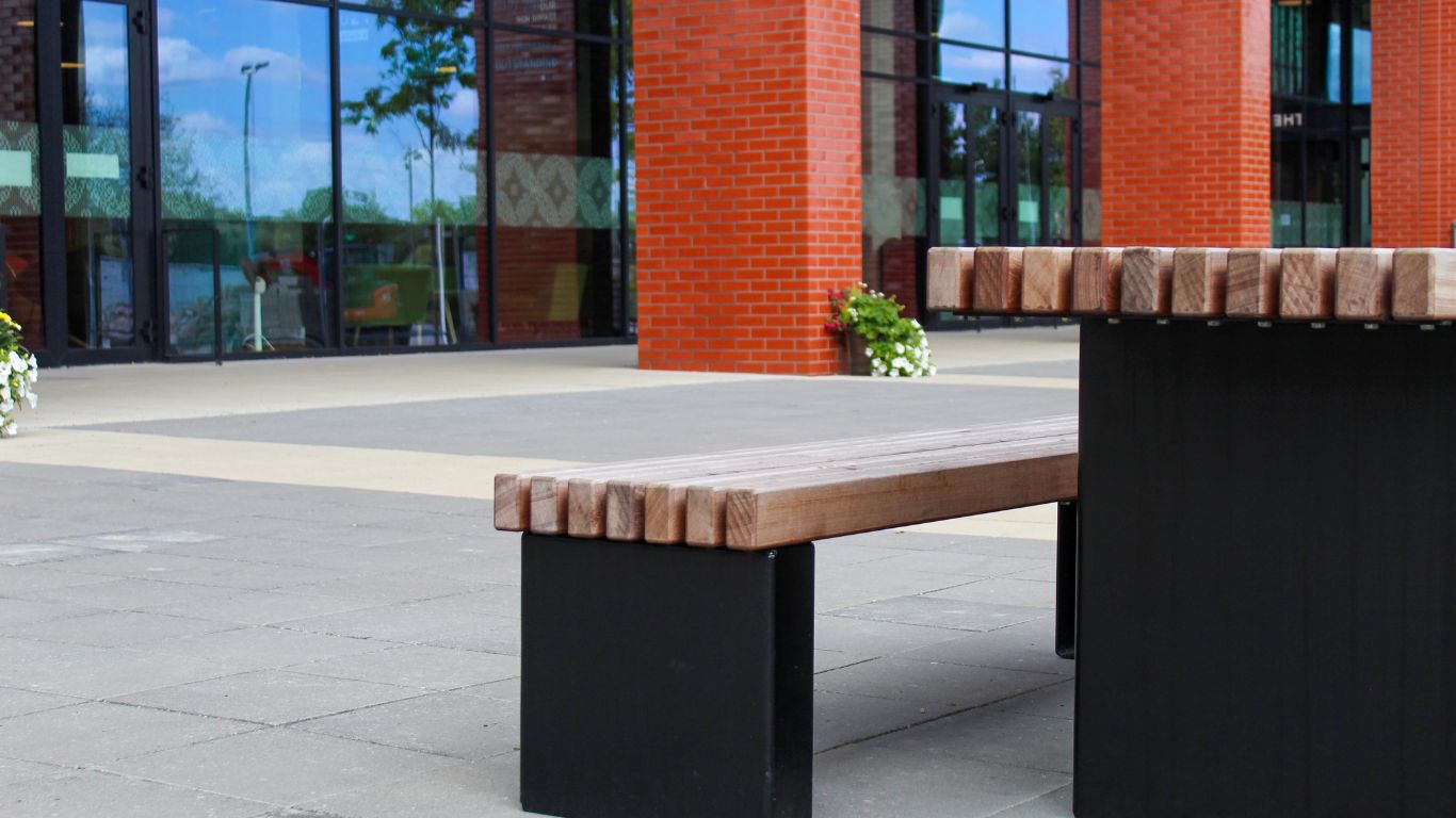 BSFG worked alongside the client Vinci Construction Ltd to deliver a multifunctional and accessible social space at the entrance to the new building. Among the products chosen were the Holgate table and bench which have been modified to incorporate an extended tabletop to improve accessibility for wheelchair users. The Holgate range features galvanised and black powder-coated legs with durable Sapele beams creating a sleek and modern design with clean lines and a minimalist aesthetic that complement the new facility.