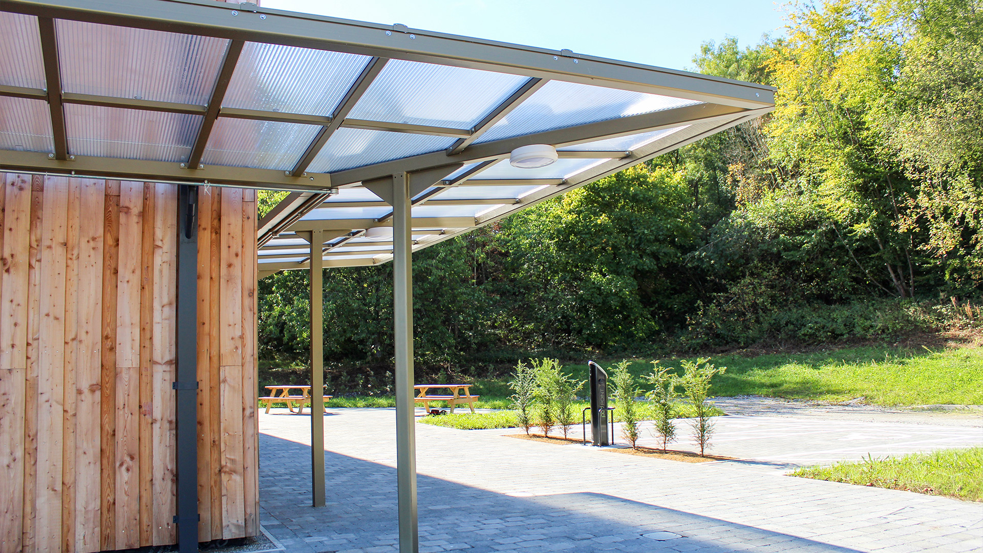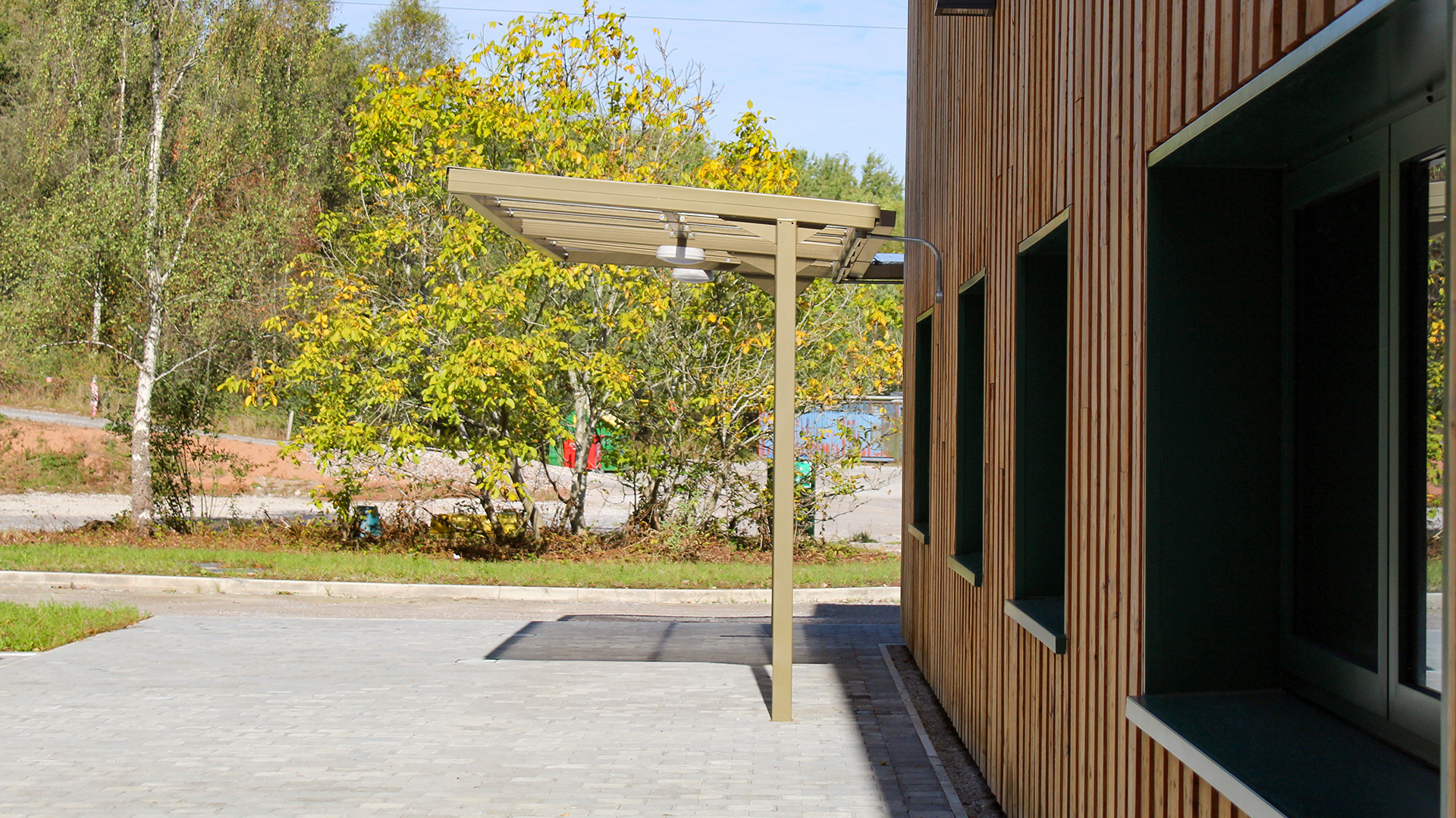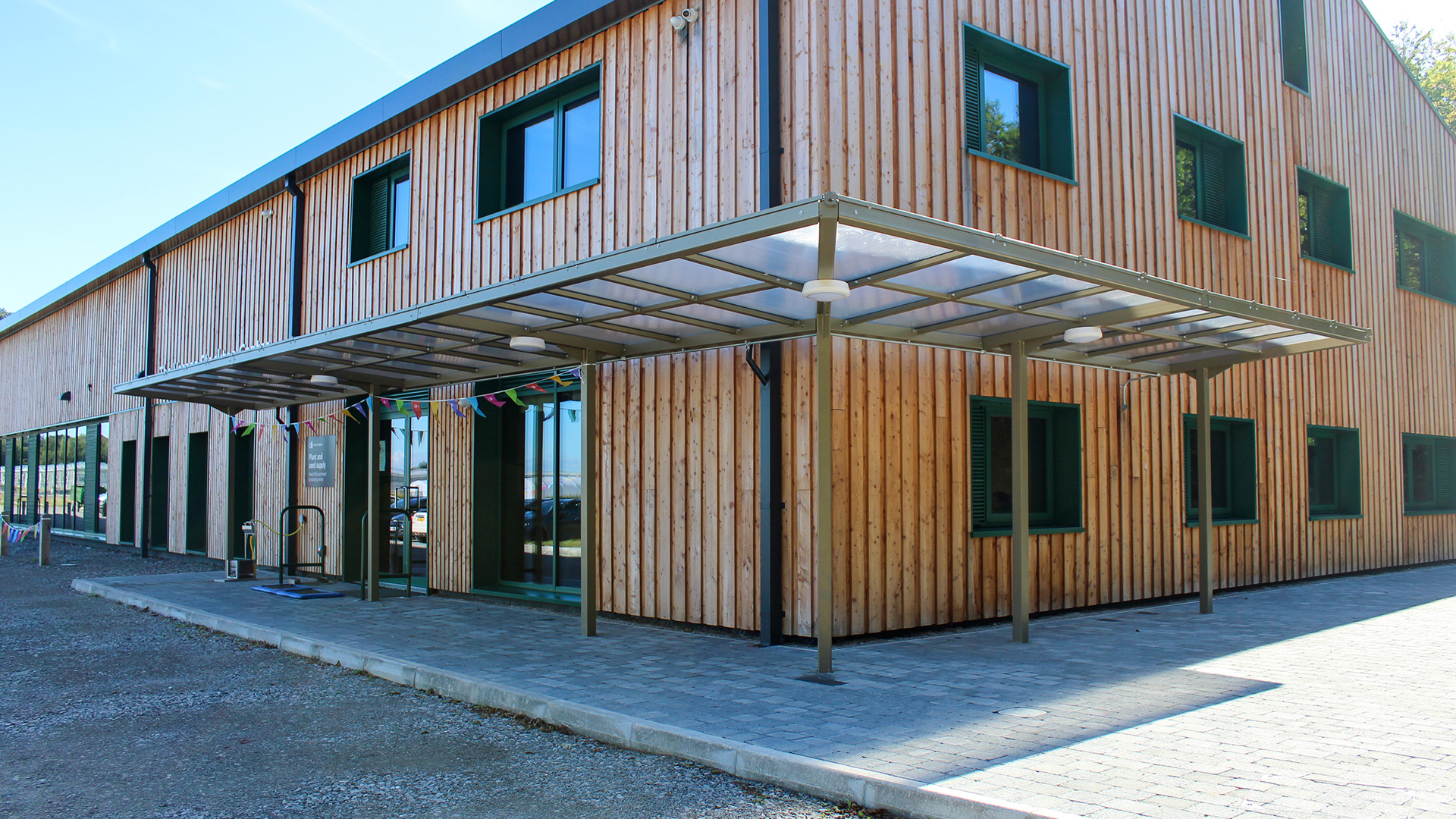 The result is a robust yet elegant canopy that complements the timber-framed, net-zero building while providing a durable, low-maintenance shelter tailored to the centre’s operational needs.